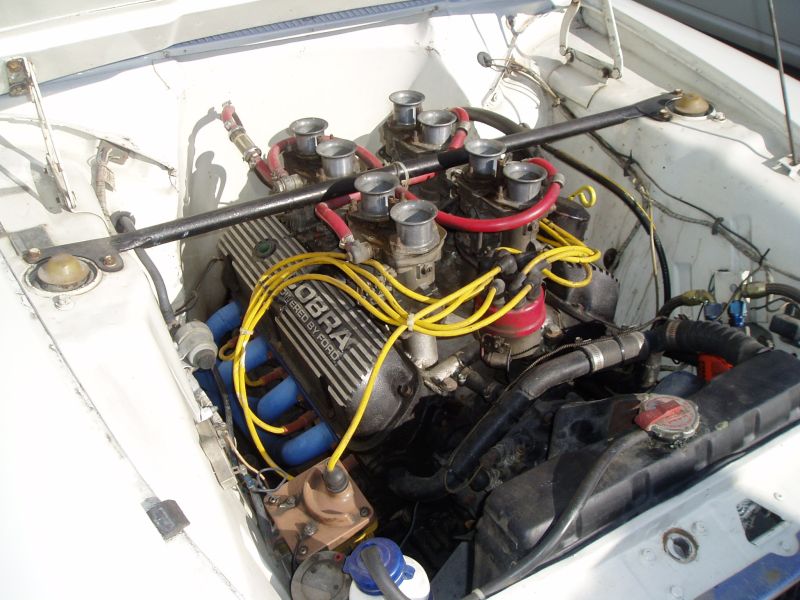 Ford 302 V-8 with 4 twin down-draft Webers. Note the large cut-out of the firewall, allowing the engine to be placed well back of the front crossmember.