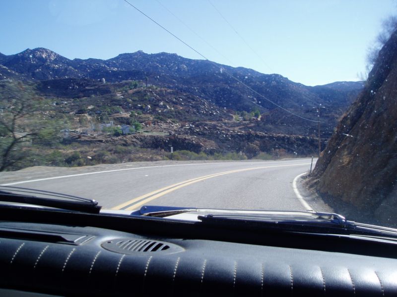 A view out of the windshield of Mike's V-8 Cortina of the burned hillsides of the back country.