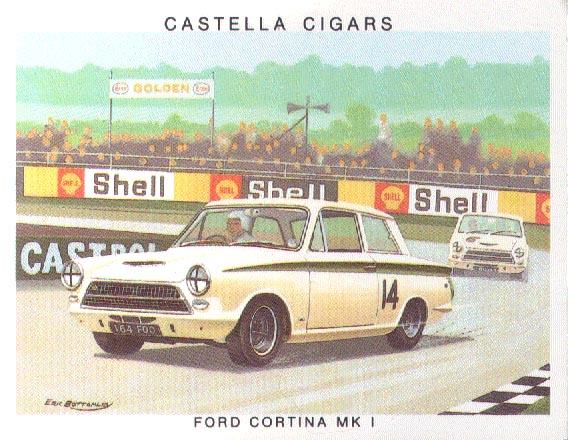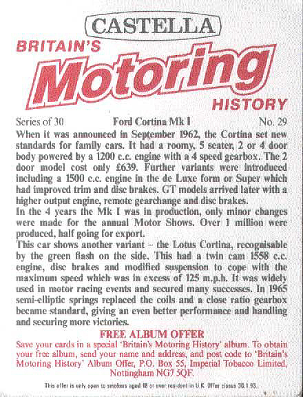 I wrote to Mr. Bottomley to ask about the cards. He tells me he did 4 different sets of paintings (30 paintings per set) and that the originals were painted in gouache on 5 inch by 7 inch panels, and then reduced by Imperial Tobacco. The Lotus Cortinas are generic, and the background is entirely fictional. Mr. Bottomley still has some sets for sale (including #29, the Lotus Cortina), and these can be supplied with the collector folder "album" designed specifically for these cards, mentioned on the back of the card above. I bought a set, and he even autographed it!