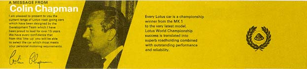 This is a little 2 inch high, 5 inches long (folded) brochure, that asks the reader inquire for further details, by filling out the back form, and sending to: Lotus Cars Ltd. Delamare Road- Cheshunt- Herts- Waltham Cross 26181