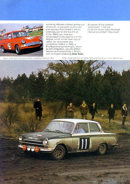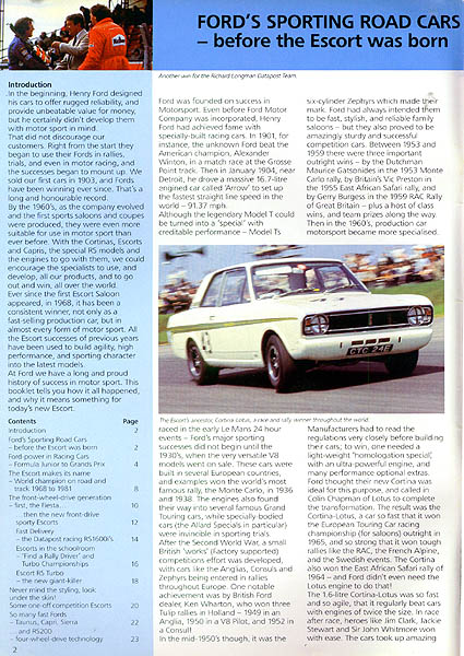 Ford Motorsport distributed this 23 page full color 8.5 x 11 inch brochure (designed and produced by Parlour Wood Ltd., London) that highlights the accomplishments of their cars with emphasis, of course, on the Ford Escort. Pages 2 and 3 mention the MK1 and MK2 Cortina-Lotus cars, with pictures of a MKII on a circuit, and a MKI being driven by Bengt Soderstrom in the 1966 RAC rally.