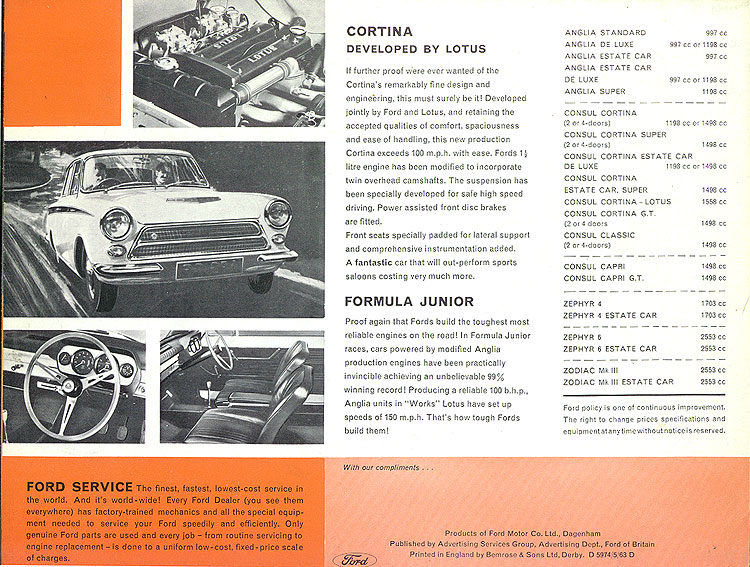 Printed in black and white and 2 shades of red, by Bemrose & Sons Ltd, Derby, it is a product of Ford Motor Co. Ltd, Dagenham, and is published by Advertising Services Group, Advertising Department, Ford of Britain. It is numbered D 5974/5/63 D. My recently purchased copy carries a stamp of "The Automobile Association" Technical Library (see picture above) indicating receipt on 31st of October, 1963. So it must have been distributed in... let's see... probably... October of 1963.
