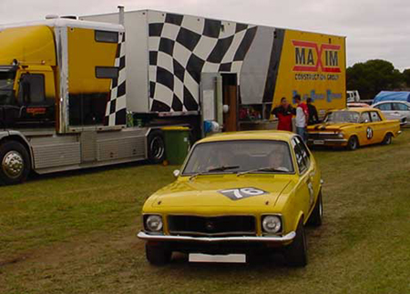 "Some of the cars from Western Australia. Pictured in front of the transporter is a GM Torana powered either by a 179 cubic in straight 6 or 5 litre v8, a very small and fast MV. Also shown is a GM EH Holden powered by 179 ci straight 6." |