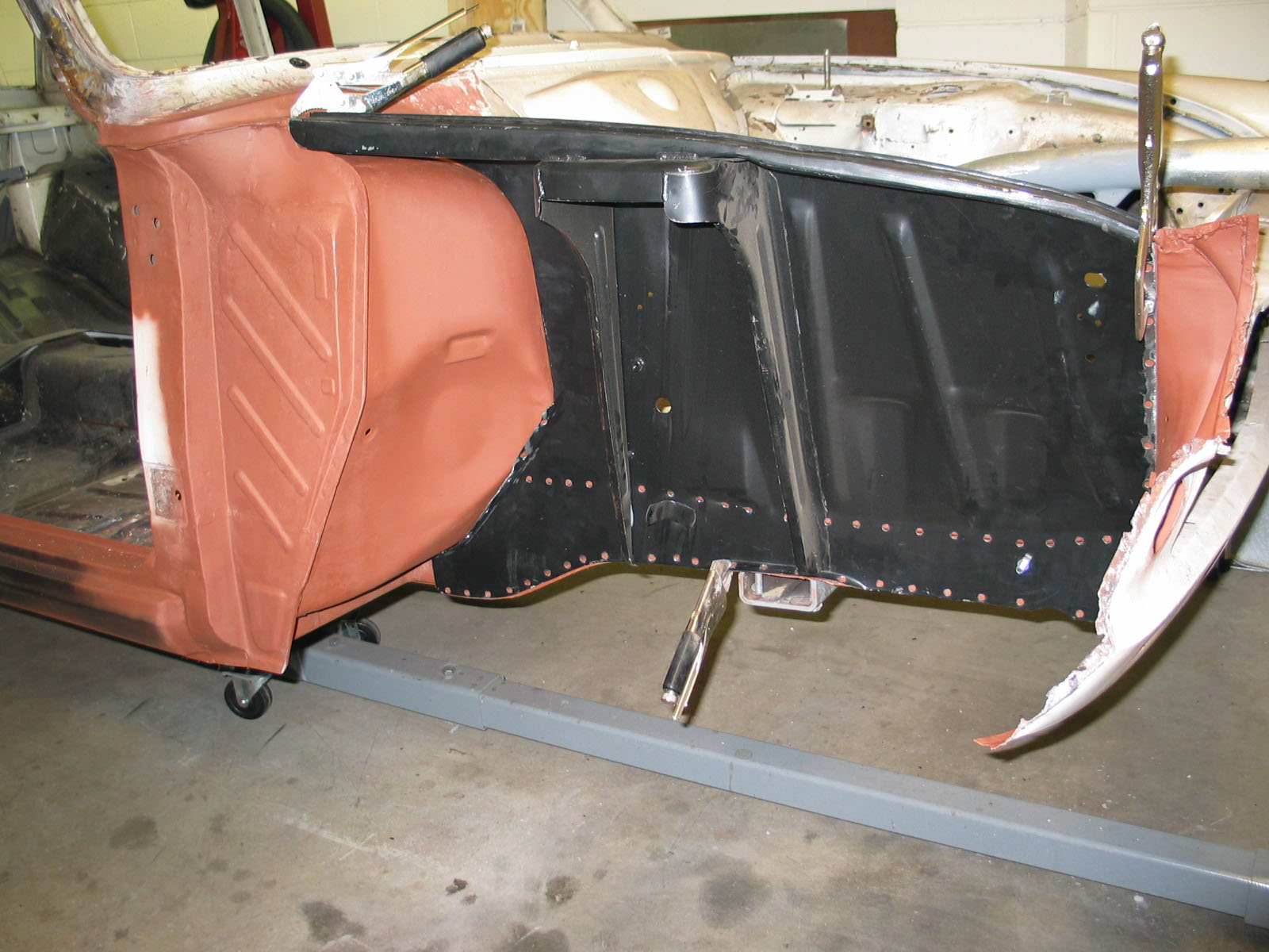 "A desire to go back to the original fuel tank, with a bladder inserted, will require replacement of the "modified" trunk floor panel. The rear lower quarter panels are going to be returned to standard without the flares, and the rear valance is to be replaced to cure the results of earlier accident and a hasty repair."