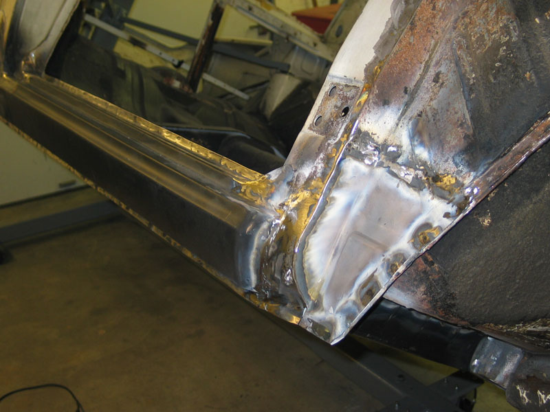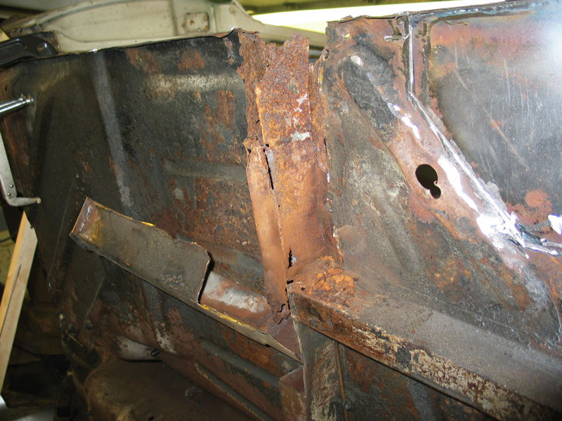 "As it turns out the damage to the "upper footwell area" was a lot easier to repair than one would expect. Once the whole area had been cleaned up, the rust hole was cut back to solid metal areas, which enlarged the missing-metal by another 50%. And as the area was not a compound curve, it was easy enough to make a template and cut new metal to fit. A lot of fiddly tacking and welding- and all fixed! The top of the kick panel is a compound curve, however, and that was repaired with a section cut out of a new repair panel made for the job, supplied by Ex-pressed Panels."