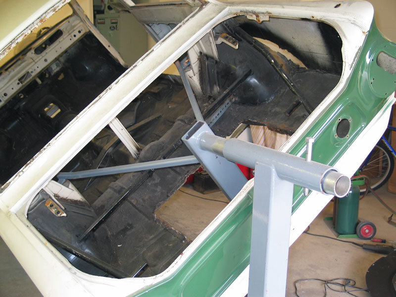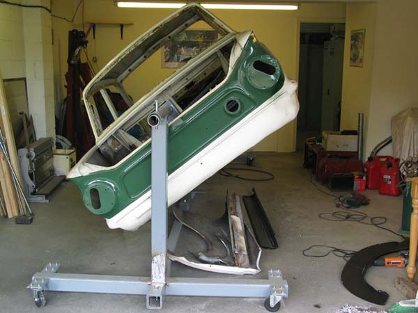"Once the body was up on the spit, one interesting point came up. It was almost impossible for me, on my own, to turn it to the full 90 degree point. This started some interesting investigation, as the pivot is exactly in the axial center of the body. So where is the Centre of Gravity on this body? Playing around with a lot of crude measuring rigs, and bringing back some of my Applied Maths, I eventually figured that it was about 4 to 5 inches above the lowest floor pan level (about at the level of the top of the centre tunnel) . That is really low - no wonder these wonderful things handle so darn well !"