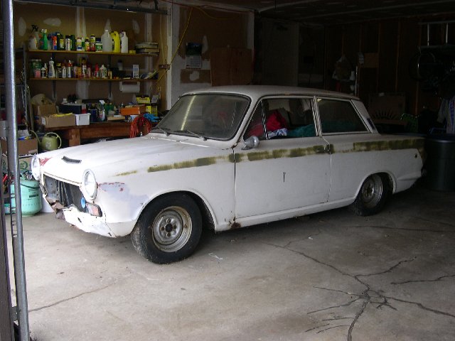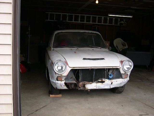This is a Lotus Cortina, BA74FT59332, in ruff shape minus the twin cam but the rest is mostly original. It has front body damage under the grill and all the usual rust spots. It has a 1969 GT crossflow motor and transmission installed but has not run for many years. I have the original trans, a spare diff plus other spare parts go with it.